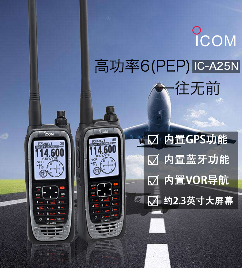 艾可慕IC-A25大屏幕對講機,產品特點:2.3英寸大屏幕,內置GPS功能,內置藍牙,智能電量,飛行規(guī)劃,內置VOR導航,BP-288電池,BC-224充電器,OPC-2379耳機連接線,重型防噪耳機。