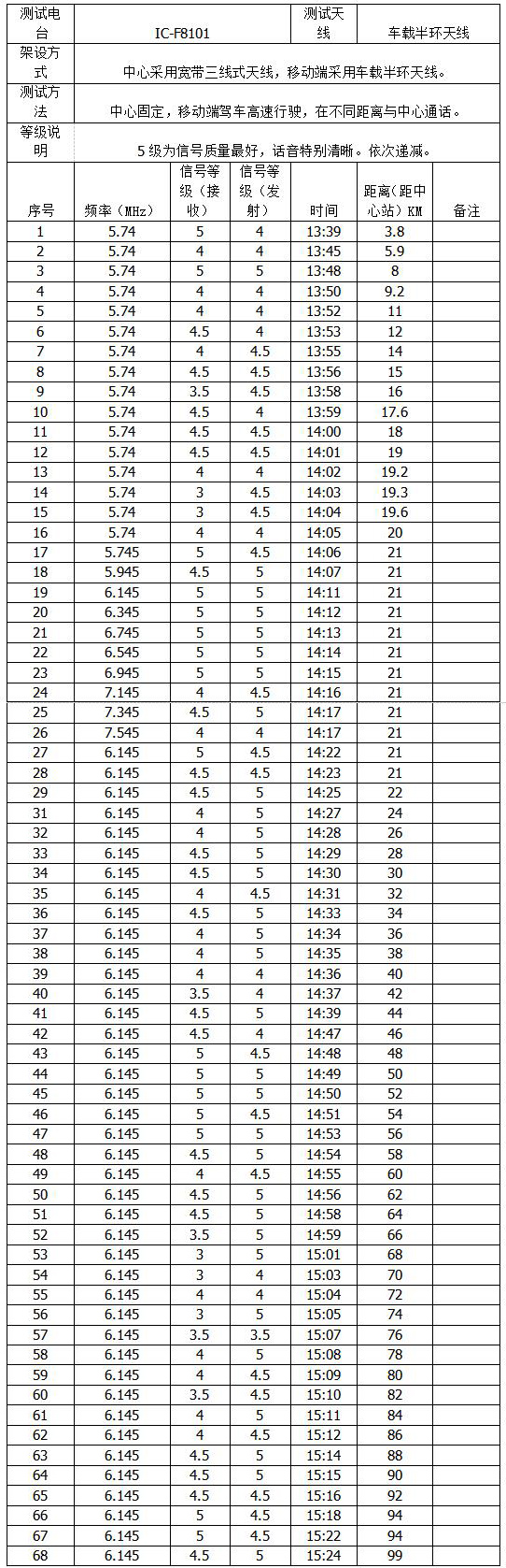 可見選用合格的高仰角半環(huán)天線在空曠高速公路上獲得了較好的通訊效果,在河北固安方向?qū)崿F(xiàn)了0--99Km的無盲區(qū)通訊。