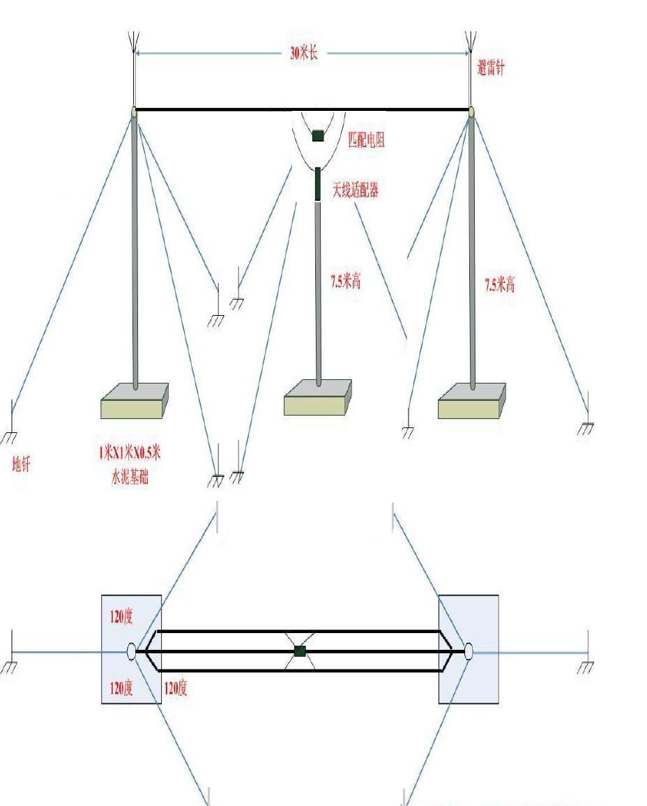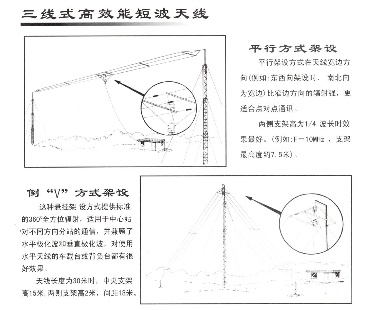 (1)短波寬帶三線式天線有平行方式架設和倒“V”兩種規(guī)范架設方式,分別適應于遠距離定向通信和全向中等(近視500Km)左右距離通信。下面是一般架設要求,實際應用中根據(jù)工作頻率可能會有更佳通訊高度和方向需要調(diào)整和試驗。