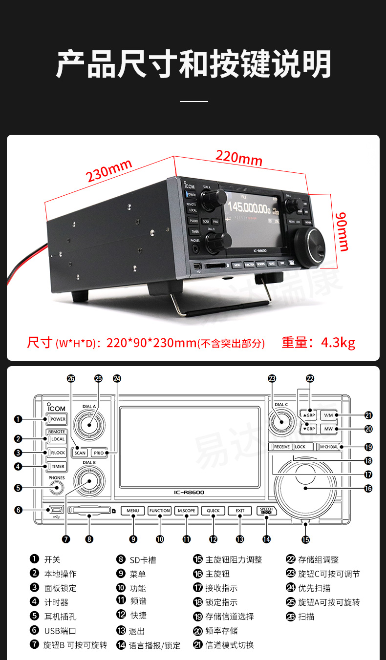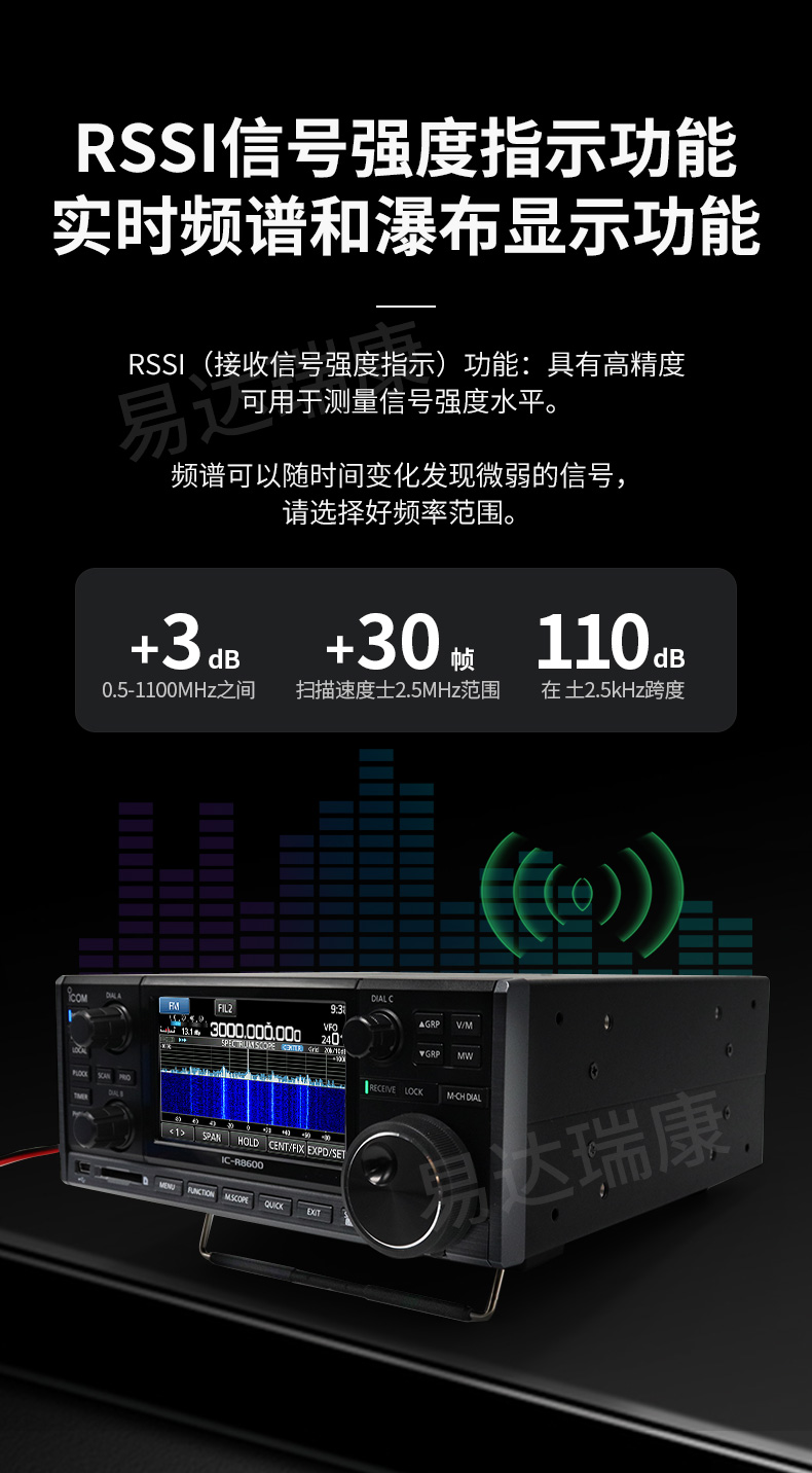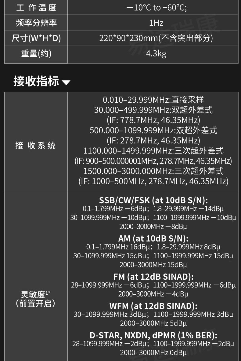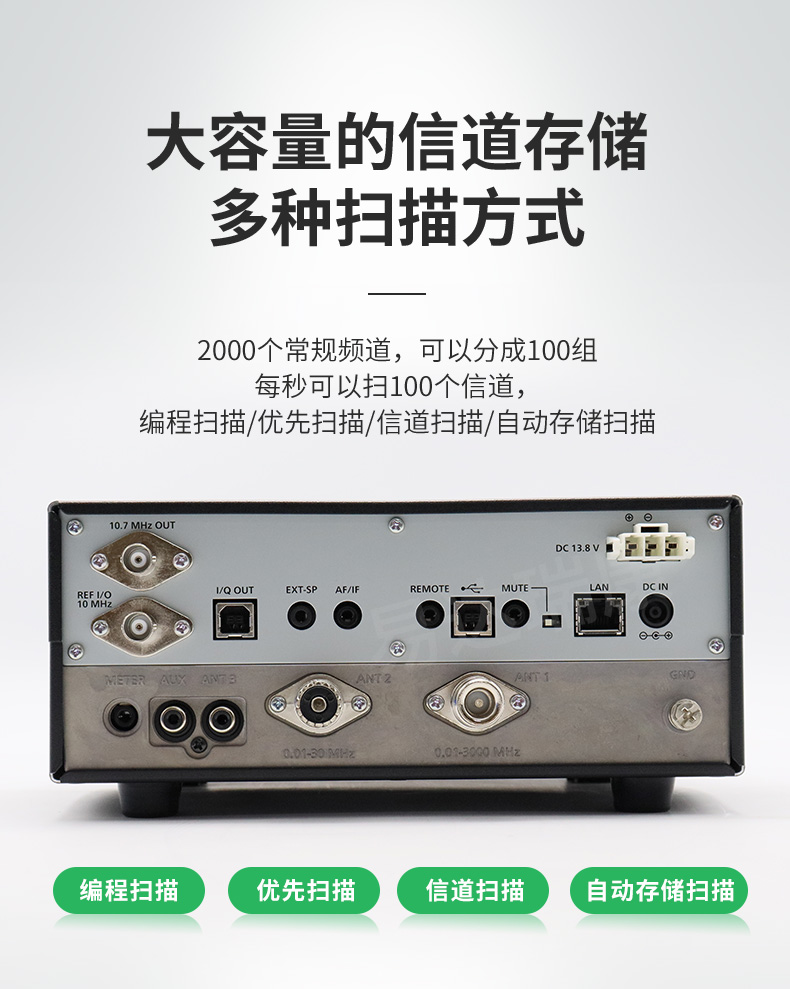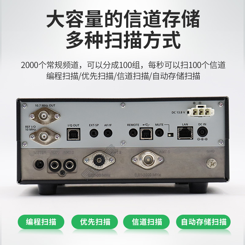 10KHz-3GHz寬頻段接收,4.3英寸彩色觸摸屏。兩種電源接入方式,2個天線端口。支持D-STAR, NXDN,dPMR,APCO ,P25模式??娠@示接收到信號的強度。