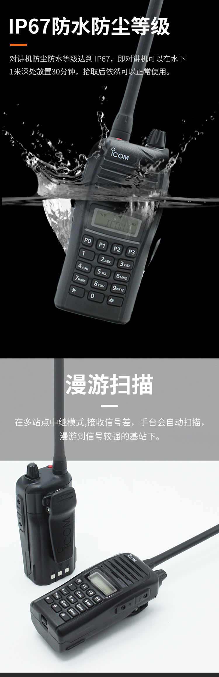 對(duì)講機(jī)防塵防水等級(jí)達(dá)到 IP67,即對(duì)講機(jī)可以在水下1米深處放置30分鐘,拾取后依然可以正常使用。同時(shí),在建筑工地 可有效的防止粉末灰塵、沙子、泥土和其他雜塵的侵入。