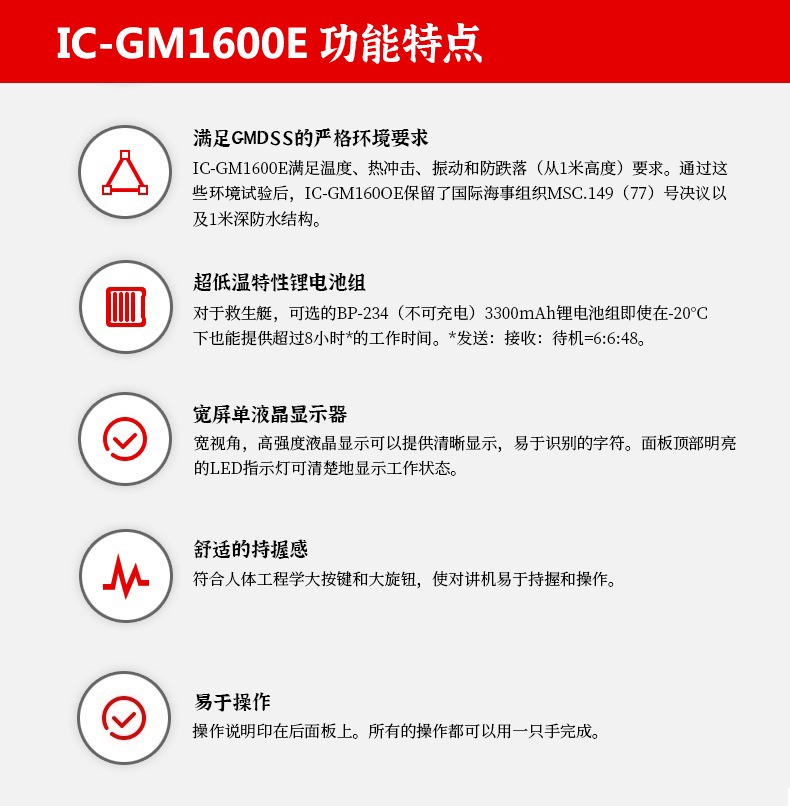 超低溫條件下同樣耐用,在-20℃條件下3300mAh鋰電池(BP-234)工作時間超過8小時 ,可提供中國船籍社(CCS)證書【證書單獨付費,周期不短,購買前請先與客服聯(lián)系確認證書提供周期】,是GMDSS設(shè)備之一。