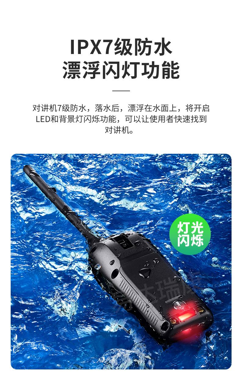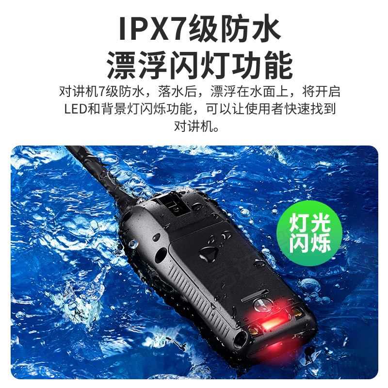 對講機可以漂浮在水面上,同時閃爍的LED燈,幫助您從水中取回它。