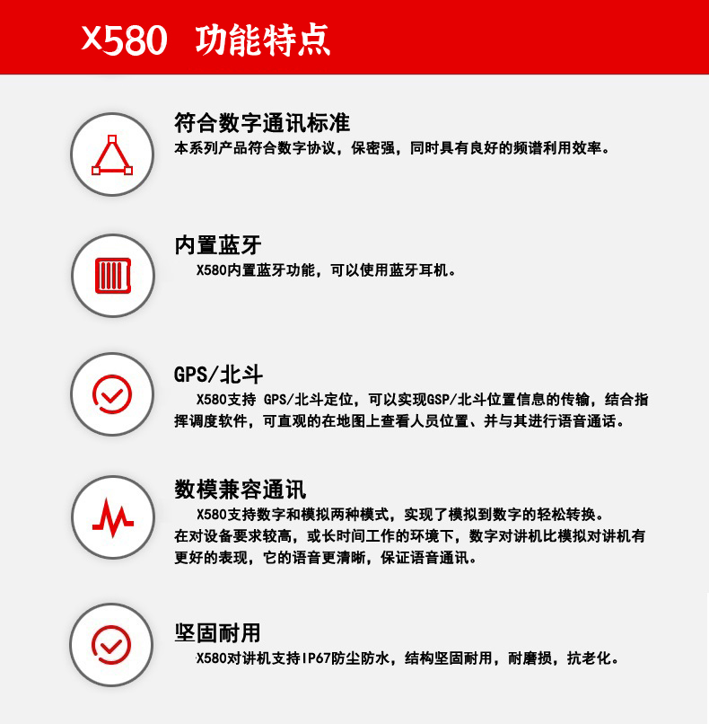 數(shù)字鍵盤可以選擇呼叫某一個人或某一組人,液晶屏可以顯示電池電量、信號強弱和所使用的信道數(shù)或具體頻率。7級防水可以保證在1米水深30分鐘不進水,本質(zhì)安全型防爆適合用在加油站,鉆井平臺,化工廠,制藥廠,燃氣站等有可能會有易燃易爆氣體和粉塵的場所。內(nèi)置GPS/北斗定位可實現(xiàn)所在位置信息的傳輸
