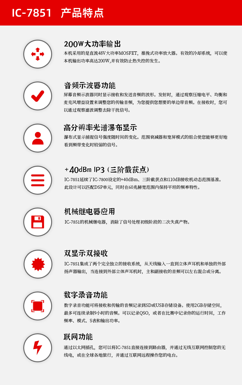 特有冷卻風(fēng)扇,保證200W大功率輸出。 液晶觸摸功能,顯示的頻譜可以進(jìn)行放大。 屏幕雙顯示接收頻率和發(fā)射頻率 可錄制接收和發(fā)射信息。 具有網(wǎng)絡(luò)功能,遠(yuǎn)程操作電臺(tái)。