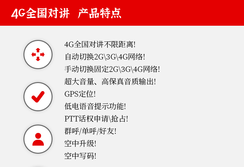 4G全國對(duì)講不限距離! 自動(dòng)切換2G\3G\4G網(wǎng)絡(luò)! 手動(dòng)切換固定2G\3G\4G網(wǎng)絡(luò)! 超大音量、高保真音質(zhì)輸出! GPS定位!