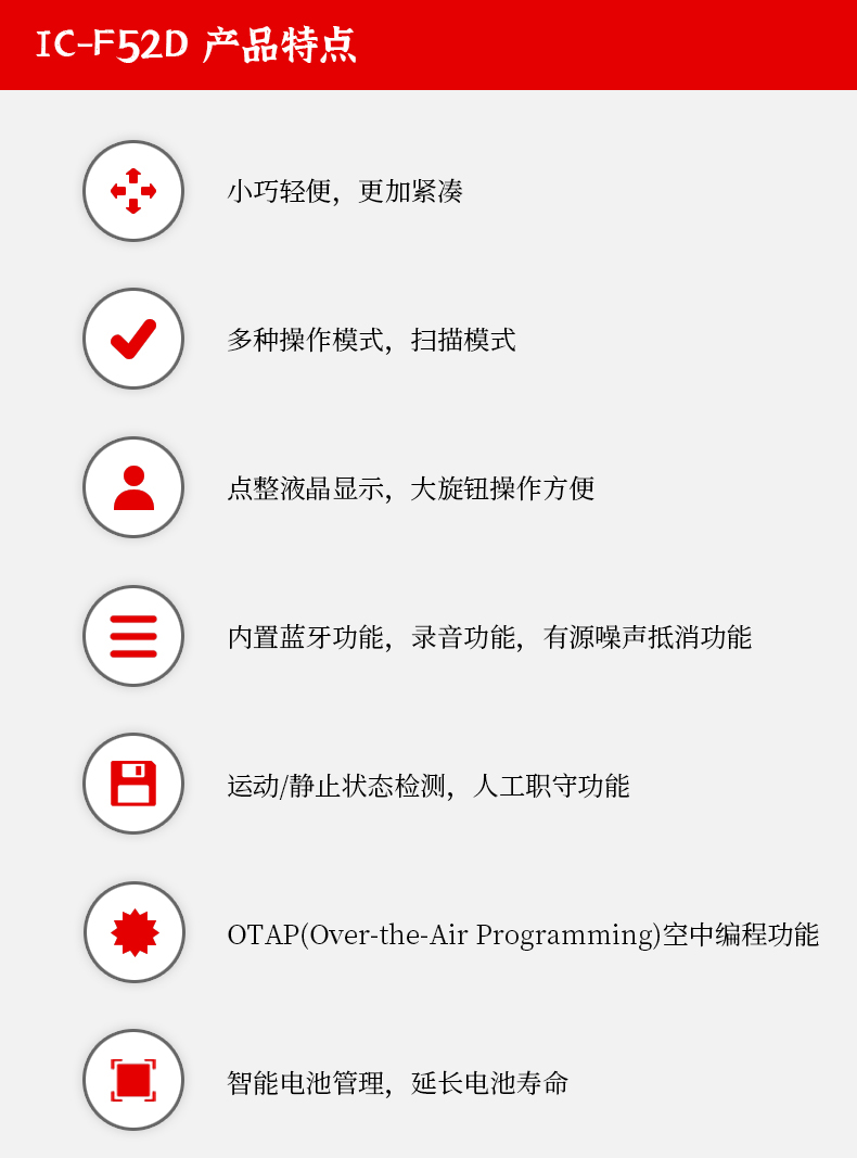 小巧輕便,更加緊湊 多種操作模式,掃描模式,使得掃描信道更方便。 點陣液晶顯示,大旋鈕操作方便 錄音功能,有源噪聲抵消功能,減少干擾。 人工職守功能,方便工作需要。