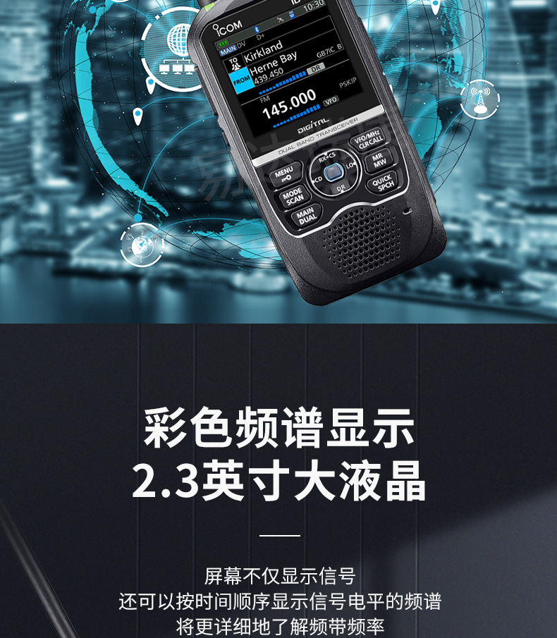 通過(guò)D-STAR網(wǎng)絡(luò)進(jìn)行全球通信 ID-52E通過(guò)D-STAR數(shù)字系統(tǒng)可以接入互聯(lián)網(wǎng),進(jìn)行單工、中繼器、地區(qū)和全球呼叫,或發(fā)送帶有數(shù)據(jù)、文本消息、GPS位置信息和圖片的數(shù)字語(yǔ)音。 2.3英寸大彩色顯示屏 ID-52E采用2.3英寸彩色顯示屏(320×280像素),具有出色的可視性。