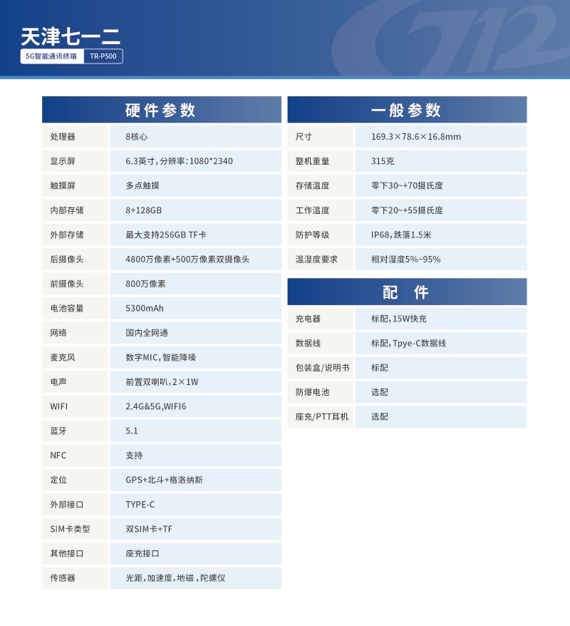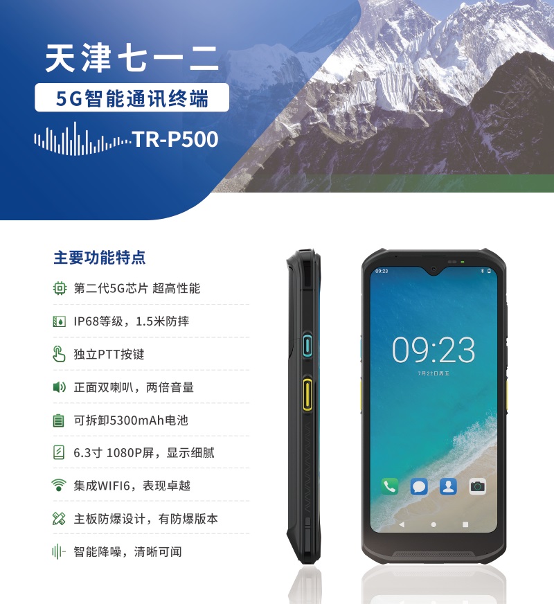 主要功能特點 第二代5G芯片超高性能 IP68等級 1.5米防摔 獨立PTT按鍵 正面雙喇叭,兩倍音量 可拆卸5300mAh電池 6.3寸 1080P屏,顯示相膩 集成WIFI6 主板防爆設(shè)計,有防爆版本 智能降噪,清晰可聞