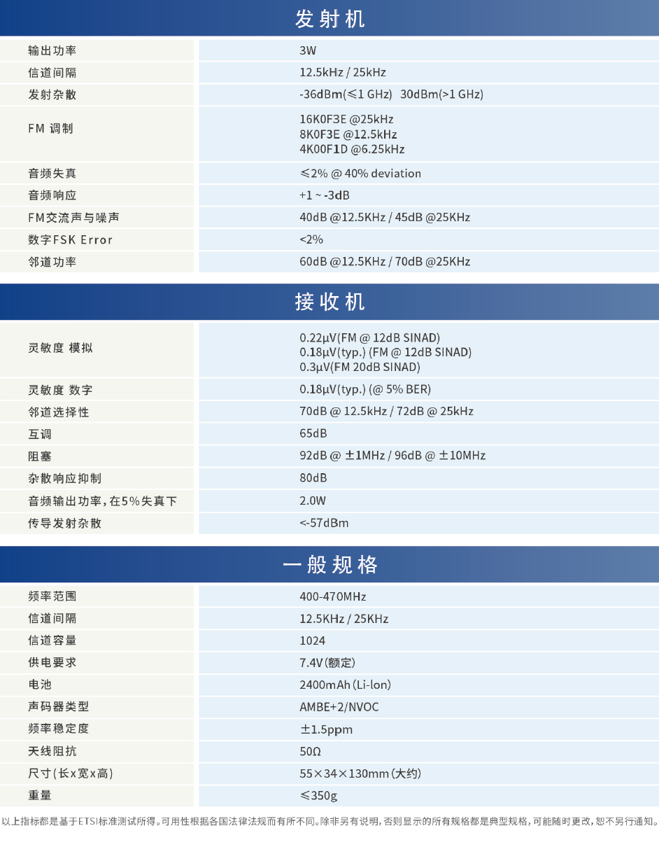 數(shù)字鍵盤可以選擇呼叫某一個人或某一組人,液晶屏可以顯示電池電量、信號強弱和所使用的信道數(shù)或具體頻率。7級防水可以保證在1米水深30分鐘不進水,本質(zhì)安全型防爆適合用在加油站,鉆井平臺,化工廠,制藥廠,燃氣站等有可能會有易燃易爆氣體和粉塵的場所。內(nèi)置GPS/北斗定位可實現(xiàn)所在位置信息的傳輸