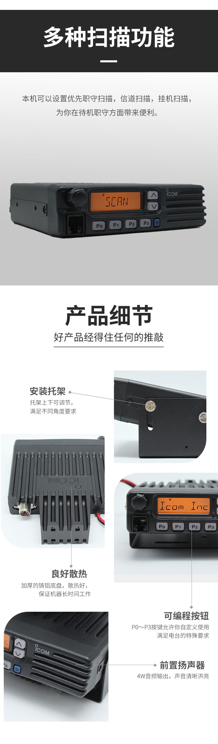 頻率范圍136-174MHz ,128個(gè)可編程信道,50W大功率輸出,多種掃描方式和普通/優(yōu)先掃描,密碼開機(jī),鑄鋁底座,有助于散熱。